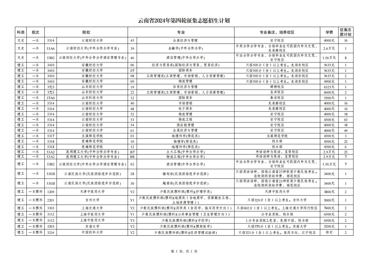 据云南省招生考试院消息:根据实际录取进度,2024年普通高校招生第四轮征集志愿工作定于7月30日至31日上午进行。本轮征集志愿涉及文理科一本批、一本预科批部分高校。