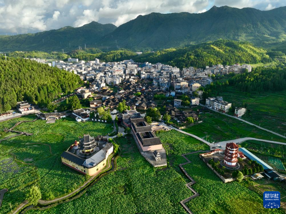 这是7月29日拍摄的浦源村百亩荷花塘及村内古建筑群(无人机照片)。