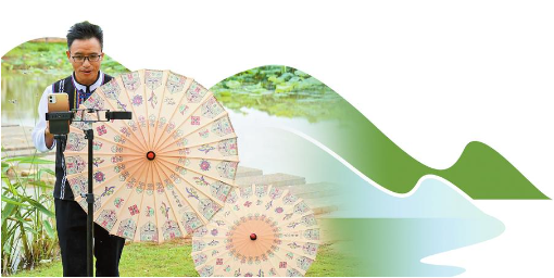 雨后的荷塘边,赵凯晨身穿壮族传统服饰,架起手机,摆上水竹花伞,开启了直播。“伞上的图案是我们壮族的壮锦,有人丁兴旺的寓意,送亲戚送朋友都很好。”赵凯晨是丘北县壮学会理事长,多年潜心学习和研究壮文化,介绍产品时,对民族文化信手拈来,吸引了不少网友观看。