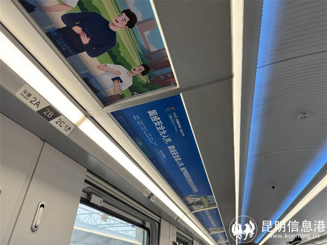 根据复兴号CR200J的车型特点,专列设置了8个不同主题车厢,突出展示新时代中国网络法治建设理念、实践成效及交流成果,通过镜框海报、玻璃贴、小桌板贴、行李架彩贴、头枕片、车内LED信息屏等形式多样的载体,全面展示网络法治30年成就、网络空间命运共同体主张。