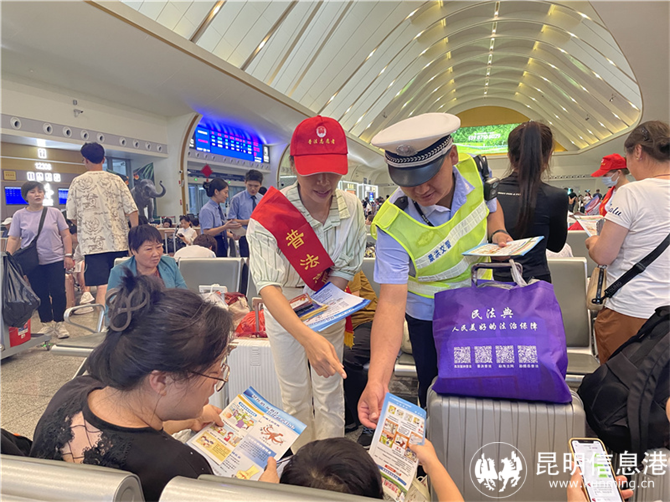 在西双版纳站的站前广场上,电子大屏上展示了2024年“全国网络普法行·云南站”活动宣传海报,大幅海报不时吸引过往游客驻足观看。同时,为了更好地做好普法宣传,当地还在站前广场设置了宣传展板区、文创展示区,组织检察院、公安局、司法局到站内开展宪法、民法典、禁毒、反诈、交通安全等主题内容的普法宣传。