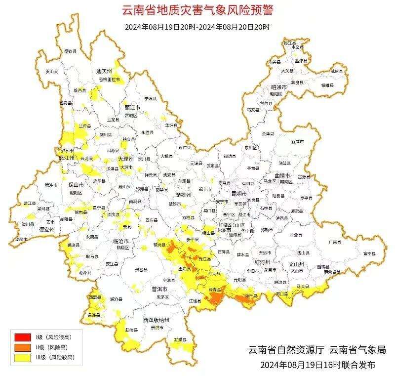 2024年08月19日20:00至08月20日20:00,玉溪市新平彝族傣族自治县、元江哈尼族彝族傣族自治县,普洱市镇沅彝族哈尼族拉祜族自治县、墨江哈尼族自治县、江城哈尼族彝族自治县,红河哈尼族彝族自治州红河县、元阳县、绿春县、金平苗族瑶族傣族自治县发生滑坡泥石流的风险高;昆明市西南部,玉溪市中部、西南部,楚雄彝族自治州中部、南部,丽江市西部和北部、东部,迪庆藏族自治州东部、南部,怒江傈僳族自治州中部、南部,大理白族自治州北部至西部、南部,保山市北部、南部,德宏傣族景颇族自治州北部、东部,临沧市北部、西南部,普洱市北部至东南部、西南部,红河州南部,文山壮族苗族自治州西南部,昭通市北部发生滑坡泥石流的风险较高。(来源:“云南地质灾害气象风险预警”微信公众号)