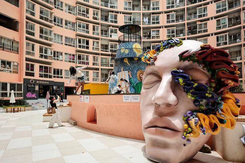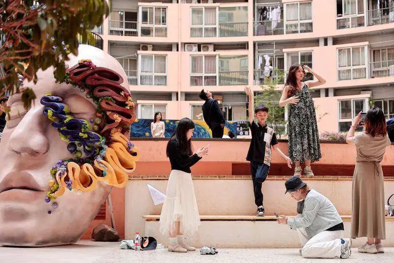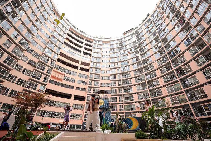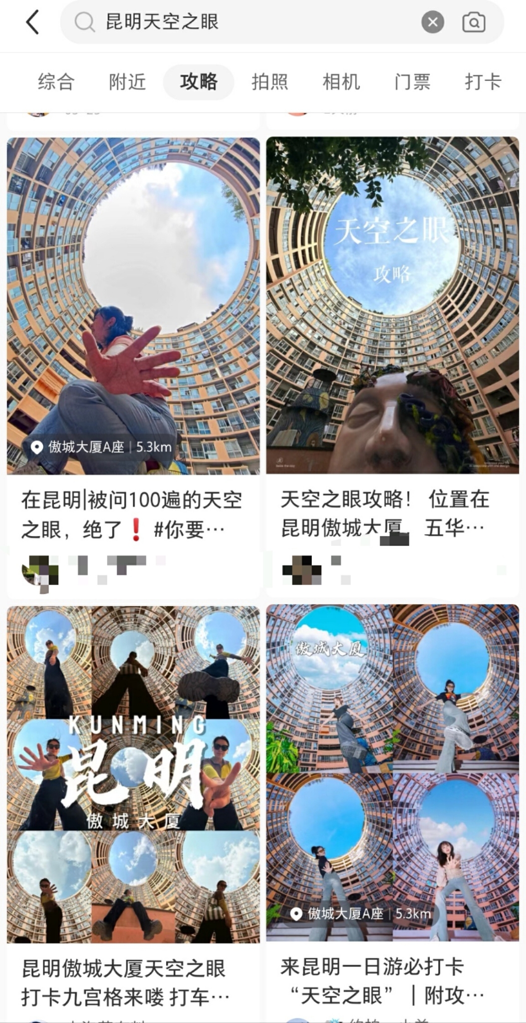 来自杭州的刘女士与来自兰州的谭女士在大理的旅途中相识并结为旅游“搭子”,两人行至昆明,一致将傲城大厦列入了打卡行程。“在平台上用广角仰拍傲城大厦,‘天空之眼’诚不欺我,这里拍的照片非常酷。”刘女士在各个角度拍了很多照,仍然意犹未尽。谭女士也感叹道:“原以为是老城中心常见的老小区,结果进来别有洞天,看得出来这个景观的用心设计,太出片了。”