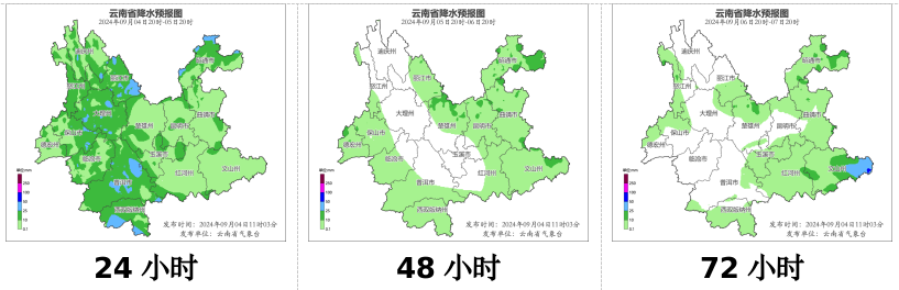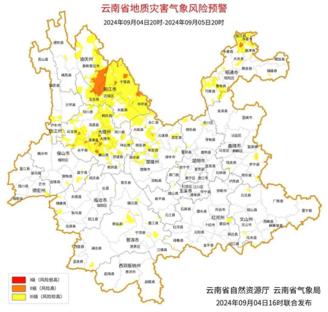 2024年09月04日20:00~09月05日20:00,昭通市永善县、盐津县、大关县,楚雄州大姚县,丽江市古城区、玉龙县、宁蒗县、华坪县,迪庆州香格里拉市,大理州大理市、漾濞县、云龙县、永平县、巍山县发生滑坡泥石流的风险高;昆明市北部、西部,玉溪市中部,昭通市北部、西南部,楚雄州北部,丽江市大部,迪庆州东部、中部,大理州大部,怒江州南部,保山市北部、东部,德宏州东南部,普洱市北部、南部,红河州南部,文山州北部、南部,曲靖市北部、南部发生滑坡泥石流的风险较高。(来源:云南气象)