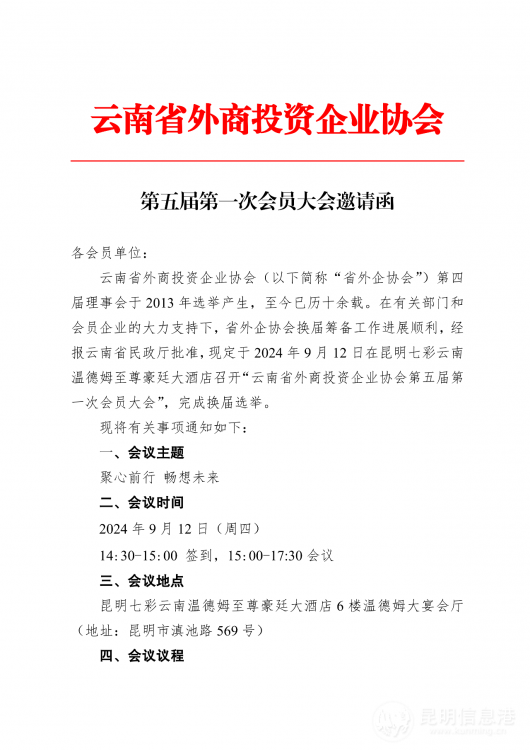昆明信息港讯 杨建东报道 云南省外商投资企业协会近日宣布,将于2024年9月12日(星期四)15:00在昆明七彩云南温德姆至尊豪廷大酒店隆重召开第五届第一次会员大会。此次大会标志着协会发展历程中的一个新起点,对于促进外商投资企业的交流与合作具有重要意义。