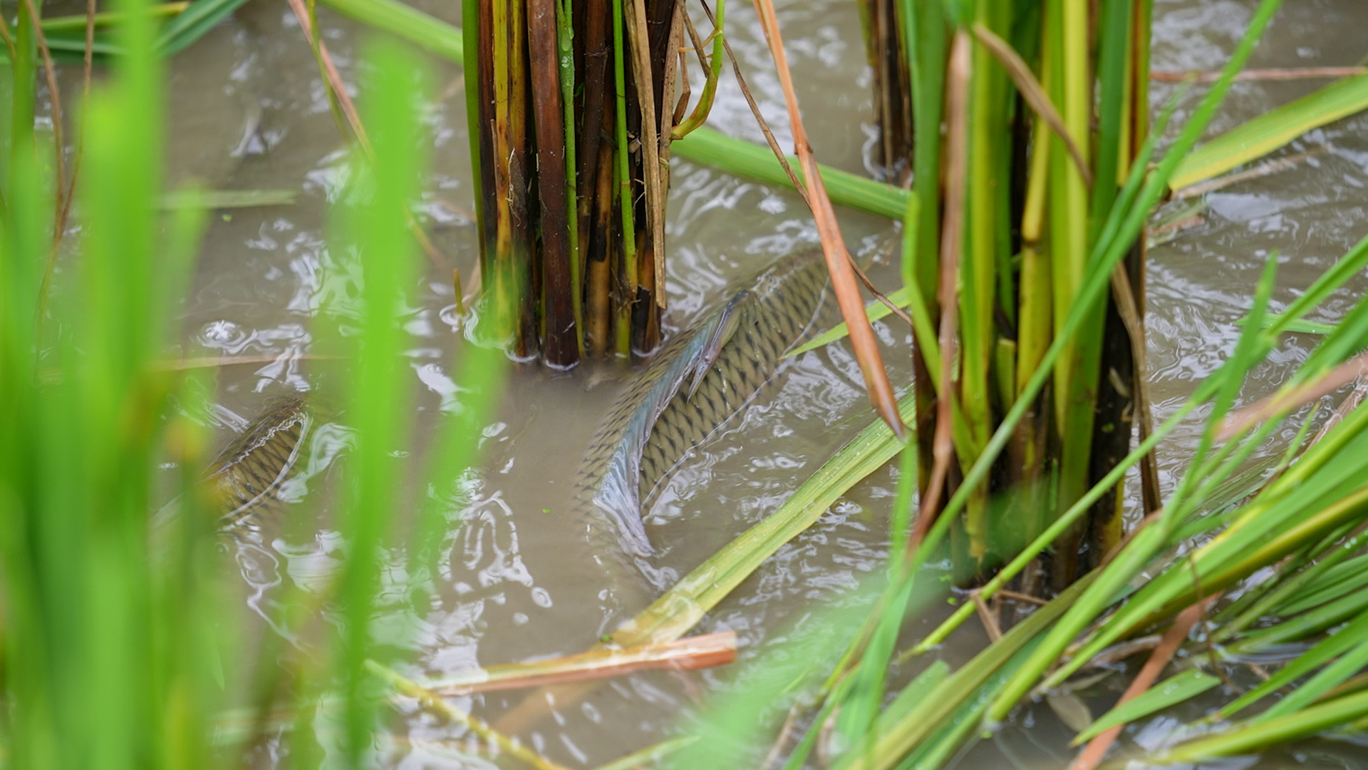 稻花鱼,即养在稻田间的鱼类。鱼以稻田里的稻花、害虫为食,稻以鱼的排泄物为肥,形成了“稻鱼共生”的良性循环生态系统。稻渔综合种养模式使传统农业单一水稻收益转变为“水稻+稻花鱼”的综合收益,提高土地利用率,实现一田双收,拓宽了百姓增收渠道。
