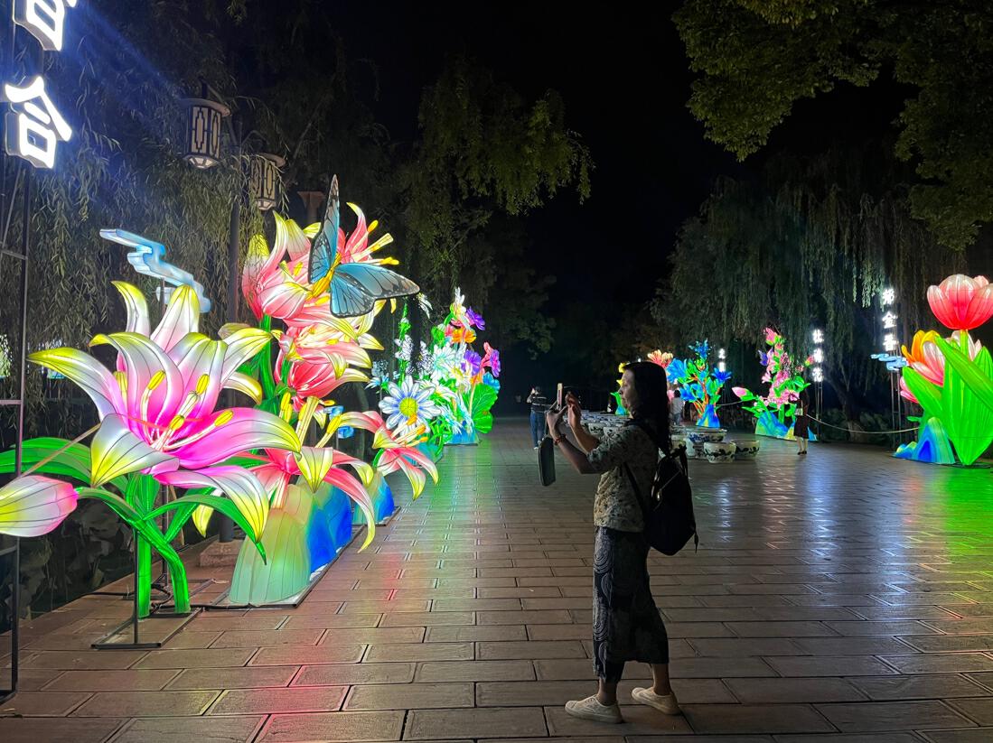 9月6日晚,“大观奇妙夜”灯会举行了亮灯测试,部分已组装完成的灯组点亮大观公园,公园入口处的月牙灯、荷花池边以荷花以及云南特色花卉、中国传统诗词为主题的灯组,让部分游客提前欣赏到了灯会。市民王女士和女儿,在云南花卉主题的灯组前拍照,流连忘返。王女士说:“灯展很漂亮,等灯展全部组装完成,还要再来体验夜游大观公园的奇妙。”