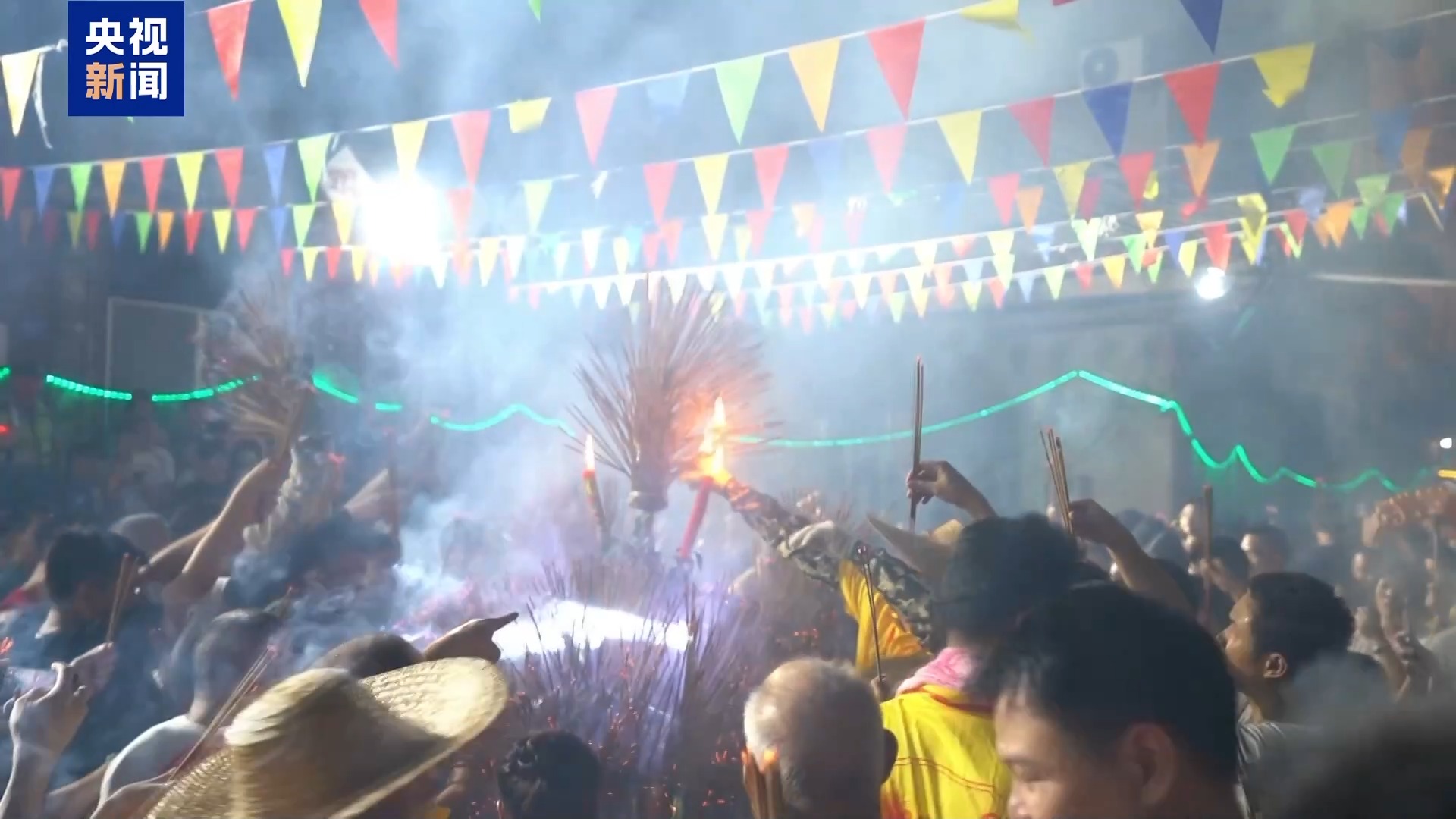 中秋节的晚上,人们点燃番塔,令火焰夹带星火向上升,激起金色火花四射。不断往上冲的火花,冲得越高就寓意来年越丰收、越兴旺。