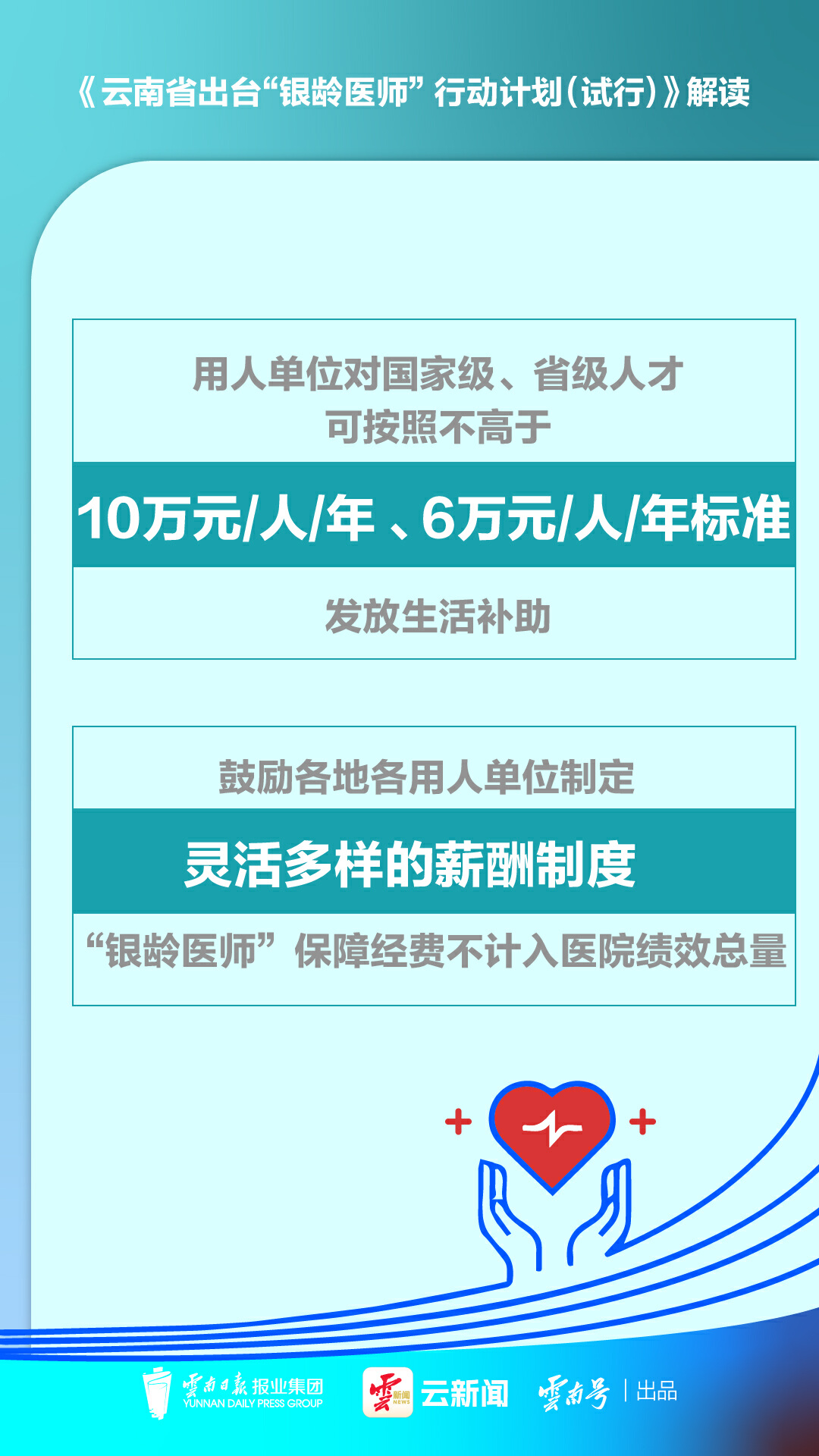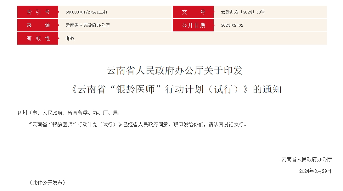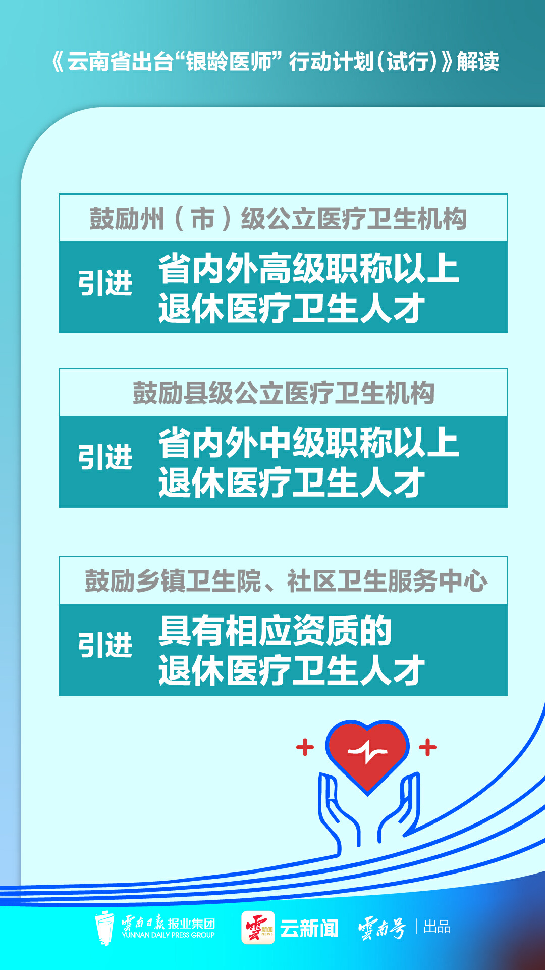 近日,省人民政府办公厅印发《云南省“银龄医师”行动计划(试行)》,聚焦当前云南卫生健康人才队伍存在的短板问题,从4个方面提出20项具体举措,吸引省内外退休医疗卫生人才到全省各级公立医疗卫生机构服务。