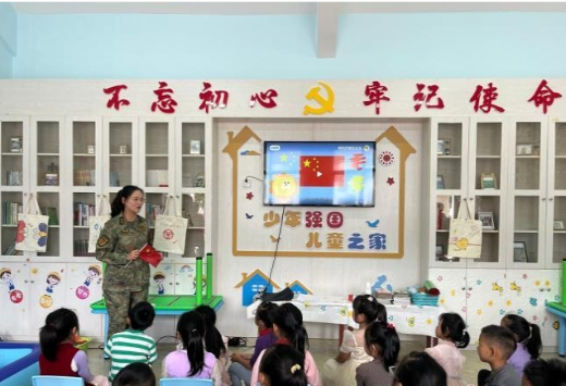 与国旗合影留念。通讯员 卫海林/摄