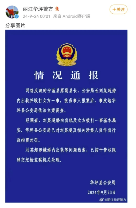 9月24日0时,丽江市华坪县公安局微博发布情况通报,详情如下: