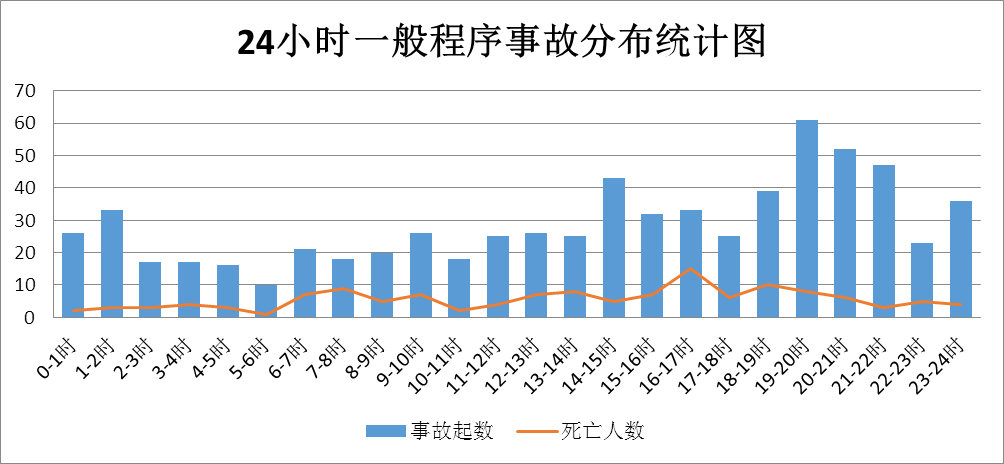 近三年国庆假期全省国庆假期交通事故主要呈现的规律特点分析如下:(一)节日第一、二天和节前一天事故高发,晚间事故较为集中。国庆假期头两天和节前一天出行集中,事故相对较多。(如图2、图3所示)。从交通事故24小时分布情况看,14时至15时、18时至22时事故高发,发生的一般程序事故占到总量的35.12%(如图4所示)。