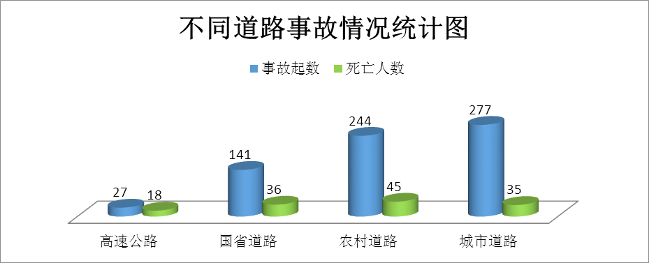 (三)农村道路事故高发,高速公路事故较平时上升,省道较大事故高发。农村道路发生的事故起数占国庆假期事故起数总数的35.41%(如图6所示)。高速公路事故起数高于平时(3.11%)0.81个百分点,特别是简易程序交通事故增幅较大,国庆期间高支队辖区简易程序事故日均91起,是平时日均17起的5.35倍。