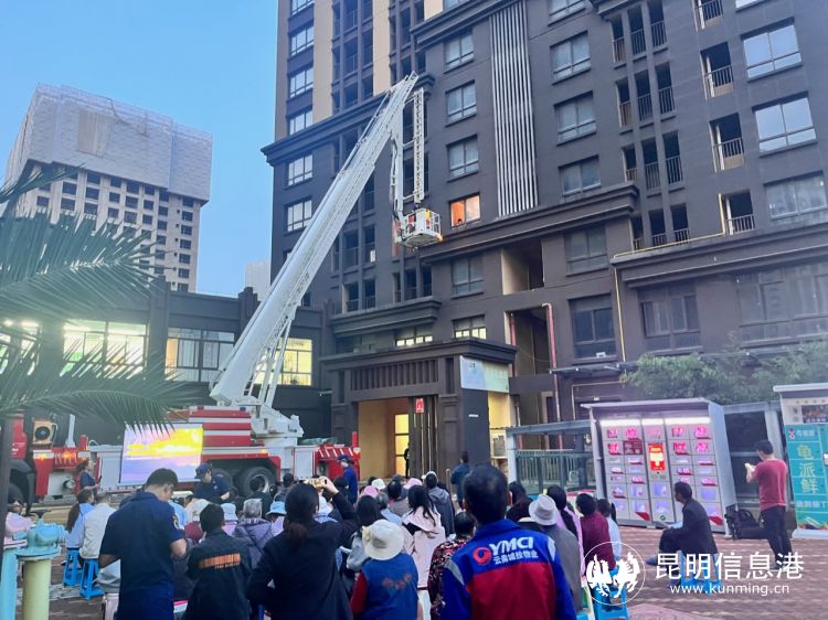 登高救援、火灾楼道逃生实景模拟演练、逃生技能等理论知识讲解,活动在城投湖畔四季城绮园开展,现场以理论结合实践,设置了丰富多样的环节内容,吸引了不少居民群众参与学习和演练体验。当高楼发生火灾应该怎么办?结合实际情况,活动现场模拟小区内J栋4楼发生火灾,有人员“被困”。随后现场的云梯消防车升起工作臂,被困人员在消防员的保护下从窗户进入登高平台,并被安全运送至地面。
