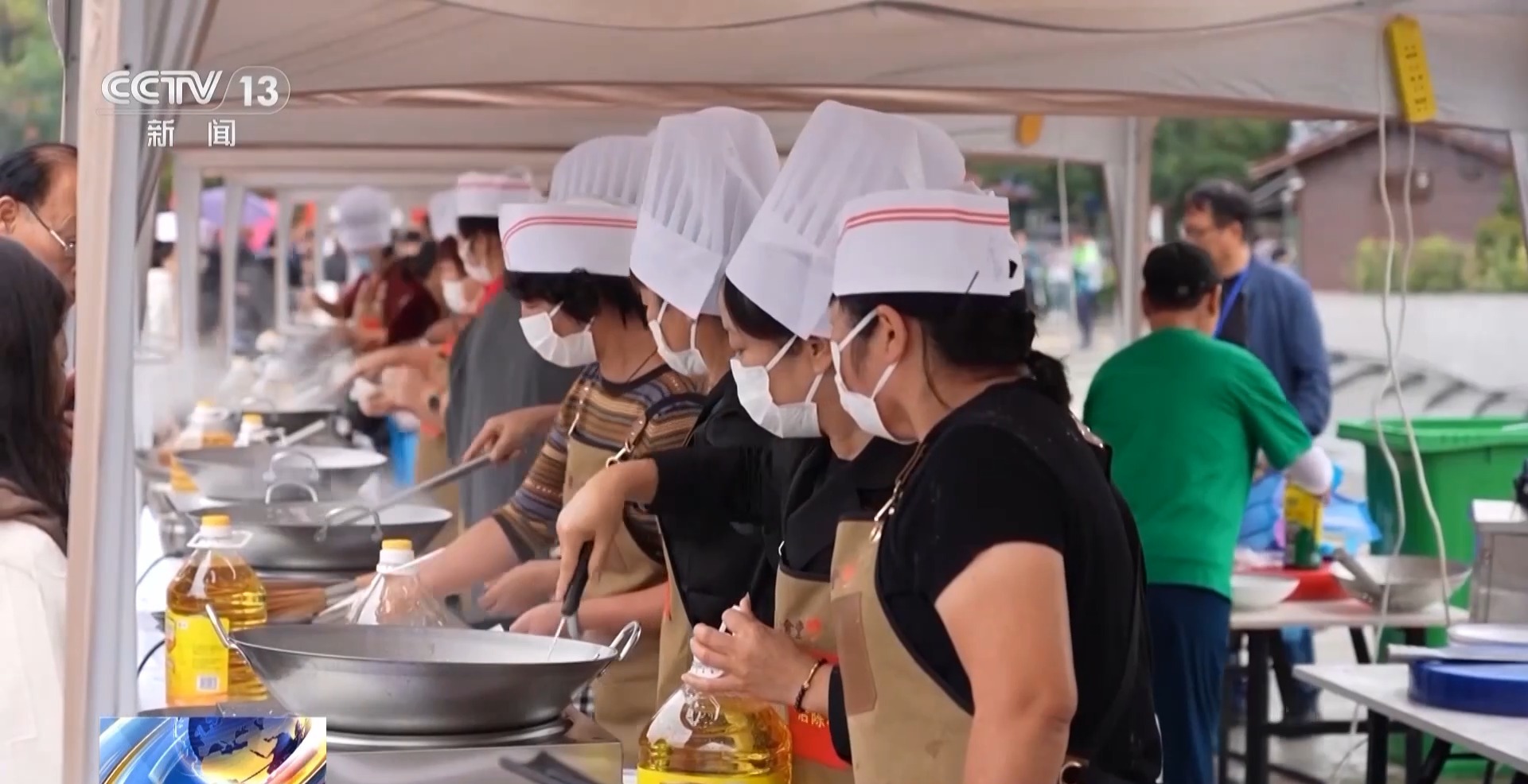 在河南鹤壁淇滨区谭峪村,乡亲们欢聚一堂,同吃团圆宴,共迎重阳节。当天,村里还有扇子舞、扭秧歌、拔河比赛等活动,为团圆宴助兴。