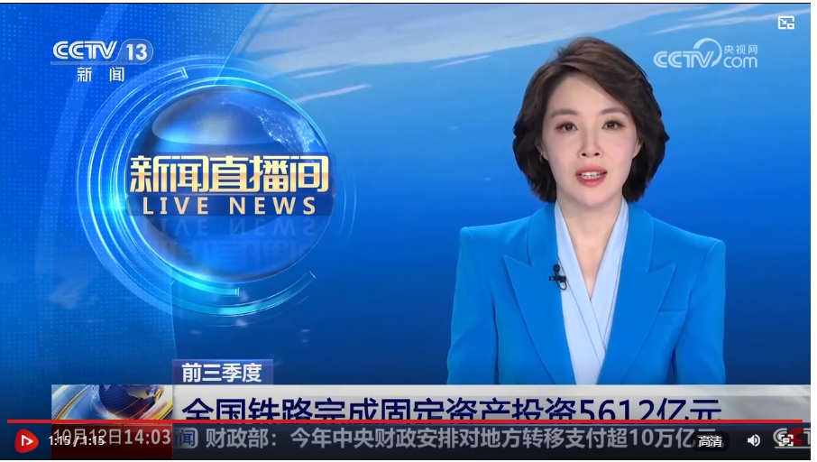 央视网消息:记者10月12日从国铁集团获悉,前三季度,全国铁路完成固定资产投资5612亿元,同比增长10.3%,为经济持续回升向好提供了有力支撑。