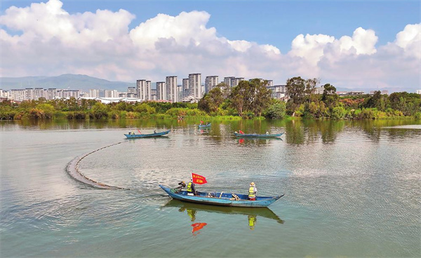 近日工作人员在滇池草海湖滨生态湿地附近水域打捞蓝藻。记者周灿/摄