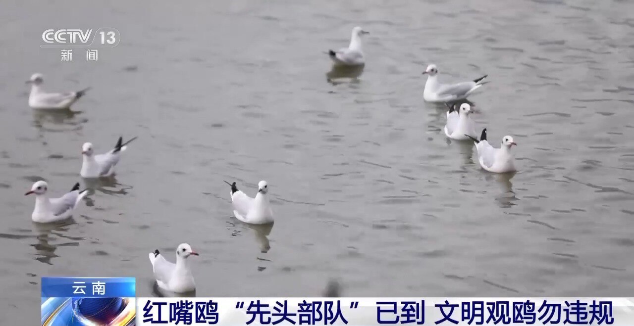 昆明鸟类协会会员 郭黎明:(今年)10月10日,亚成鸟在这里出现了,就是以亚成鸟出现的特征,作为(红嘴鸥)“先头部队”到昆明的一个标志,大概就是一个月左右,大部队就全部到了,它们(到时候)就分布在昆明的各个观鸟点了。