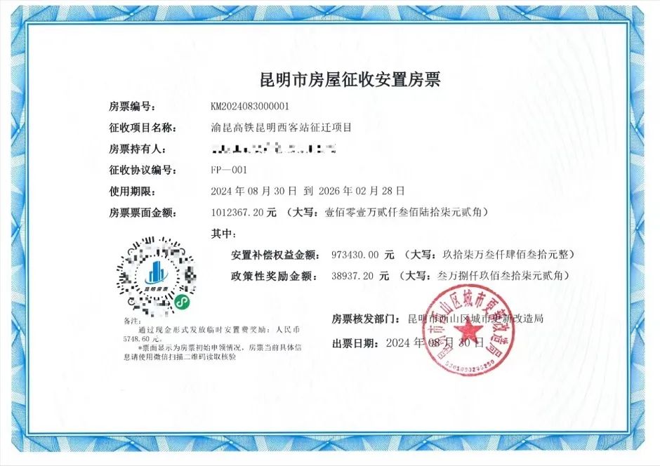 今年8月30日,西山区城改局对渝昆高铁昆明西客站征迁人,发放了一张面值约101万元的房票,这张房票包含约97.343万元的安置补偿款,以及约3.8937万元的政策性奖励金,使用期限为2024年8月30日(房票发放日)至2026年2月28日,相当于1年半的有效期。这也是昆明发放的首张房票。