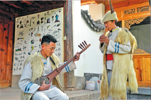 在小院一角,和凛毅父子为我们展示古乐“师徒相授”的过程。和凛毅手持竖笛,吹出一个乐音,儿子和福成怀抱传统弹弦乐器“苏古笃”,左手按弦,右手拇指拨弦,弹出相近的乐音。父与子以“乐音”交谈,转轴拨弦间达成默契。(云南日报 记者黄立康)