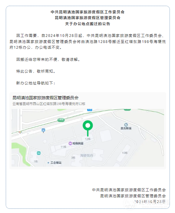 昆明信息港讯 记者杨雁 因工作需要,自2024年10月28日起,中共昆明滇池国家旅游度假区工作委员会、昆明滇池国家旅游度假区管理委员会将由滇池路1288号搬迁至红塔东路198号海埂悦府12栋办公,办公电话不变。