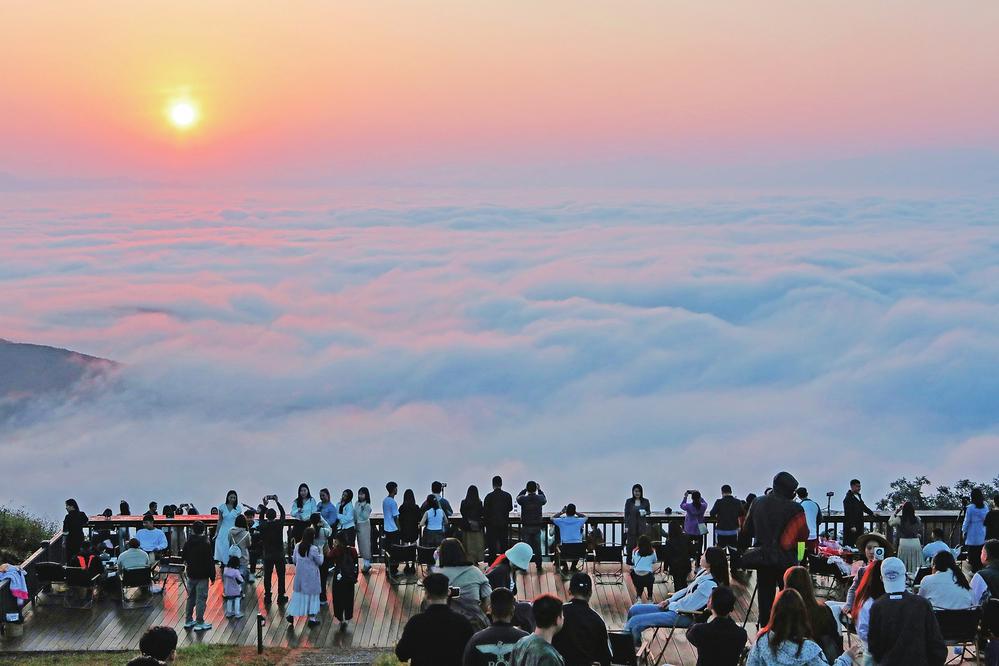 临近冬季,国内多地开启降温模式,不少游客前往西双版纳游览热带风光、体验民族风情,当地旅游市场呈现淡季不淡的景象。图为11月3日,游客在景洪市基诺山基诺族乡巴卡村观赏云海日出。 李云生 摄 新华社发