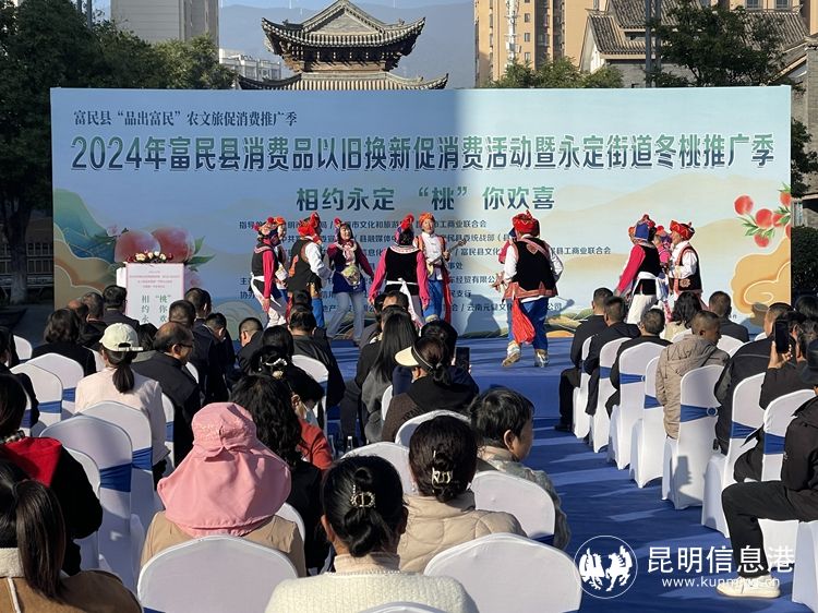 昆明信息港讯 记者龙泉积 2024年富民县消费品以旧换新促消费·富民县“品出富民”农文旅促消费推广季暨永定街道冬桃推广季系列活动启动仪式在上河院文创旅游小镇举行。现场,文艺表演、冬桃季摄影作品展、“桃王争霸赛”、以旧换新促消费等系列活动,让广大市民品尝到冬桃的甜美,享受到购物的优惠,领略到富民的魅力。