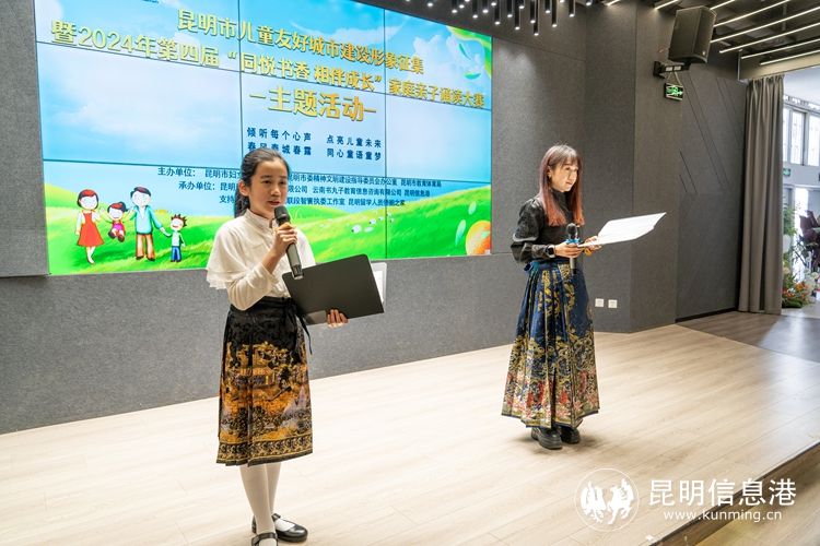 活动现场,昆明市儿童友好城市建设形象征集活动和2024年第四届“同悦书香•相伴成长”家庭亲子诵读大赛的成果通过视频向公众展示。主办方向昆明市儿童友好城市建设形象征集获奖作品、诵读大赛中脱颖而出的家庭进行了颁奖。