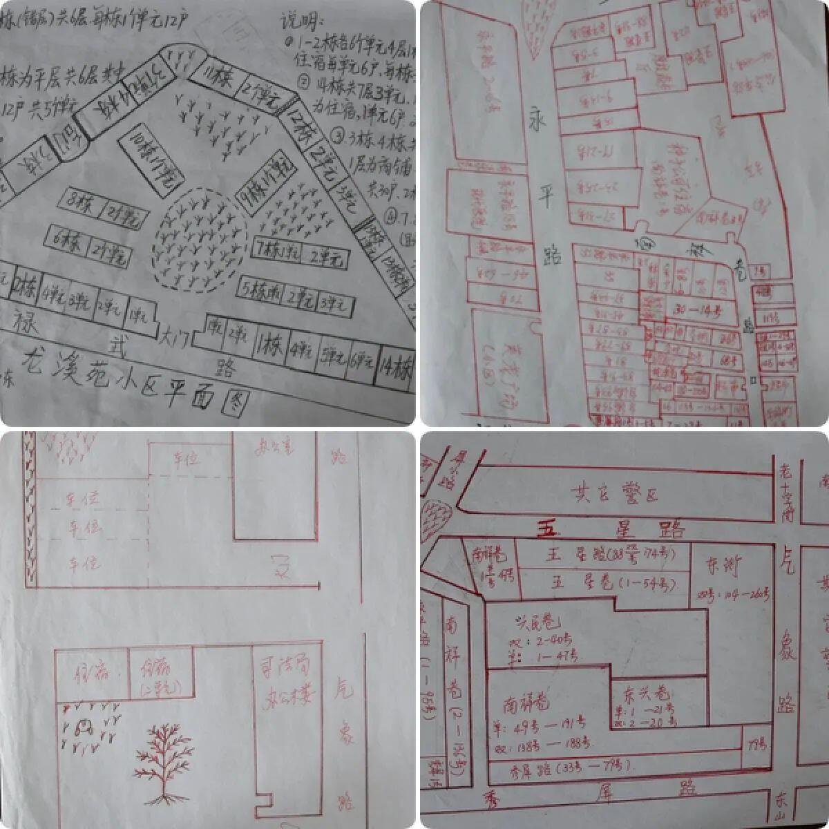 白天,董顺芬进村走访时便详细记录每家每户的地理位置,晚上将记录到的信息落于纸上,一张张手绘的辖区网格地图上,密密麻麻地标注着每一个门牌号码、每一处场所单位、每一家沿街商户……许多连卫星地图都查询不到的坐标,在她的地图上一目了然。