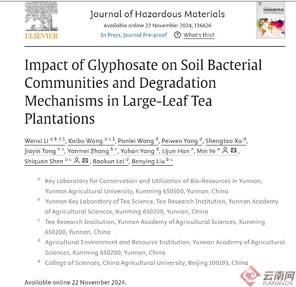 近日,云南省农业科学院茶叶研究所申时全研究员团队与云南农业大学叶敏研究员团队合作,在茶园土壤生态领域取得了重要研究成果。研究通过结合农药降解分析、微生物组学及富集培养试验,系统探讨了除草剂草甘膦在茶园土壤中的降解特性、对细菌群落的影响及其潜在的微生物降解机制。相关成果以“草甘膦对大叶茶园土壤细菌群落的影响及其降解机制”为题,在线发表在国际著名学术期刊《Journal of Hazardous Materials》(《危险材料杂志》,影响因子12.2,中科院一区)。