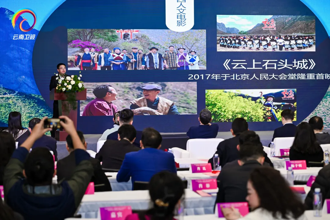 云南文化产业招商引资推介会现场,宝山乡党委副书记、乡长宋德逻作推介。(图源:云南卫视)