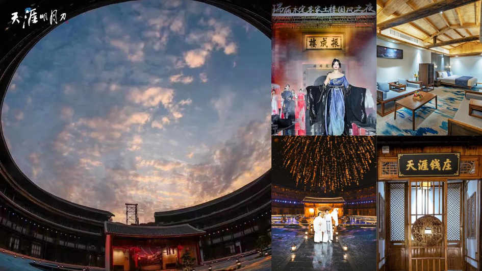 在此背景下,天涯明月刀以数字IP为主题,融合客家非遗和土楼建筑特色,引入国风电竞元素,布局沉浸式互动演出等业态,进行数字化文创内容创作,形成“土楼+非遗+沉浸式剧场+主题民宿+电竞赛事”等多元化沉浸式文旅项目,建设内容主要包括沉浸式剧场、天衣华裳旅拍中心以及主题民宿,并配套近水茶轩、郑谷楼等多元业态项目。该案例与非遗的结合主要体现在“IP内容共创”“场景体验共创”“产业生态共创”三大方向。