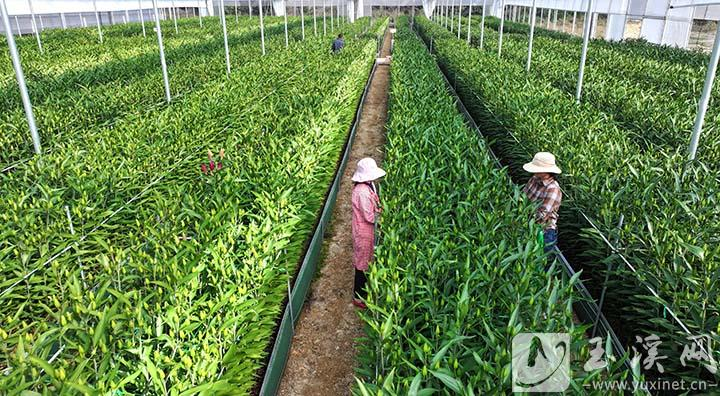 工人正在玉溪曙禾花卉有限公司的种植大棚里管护百合花。 玉溪市融媒体中心记者 曾永洪 摄
