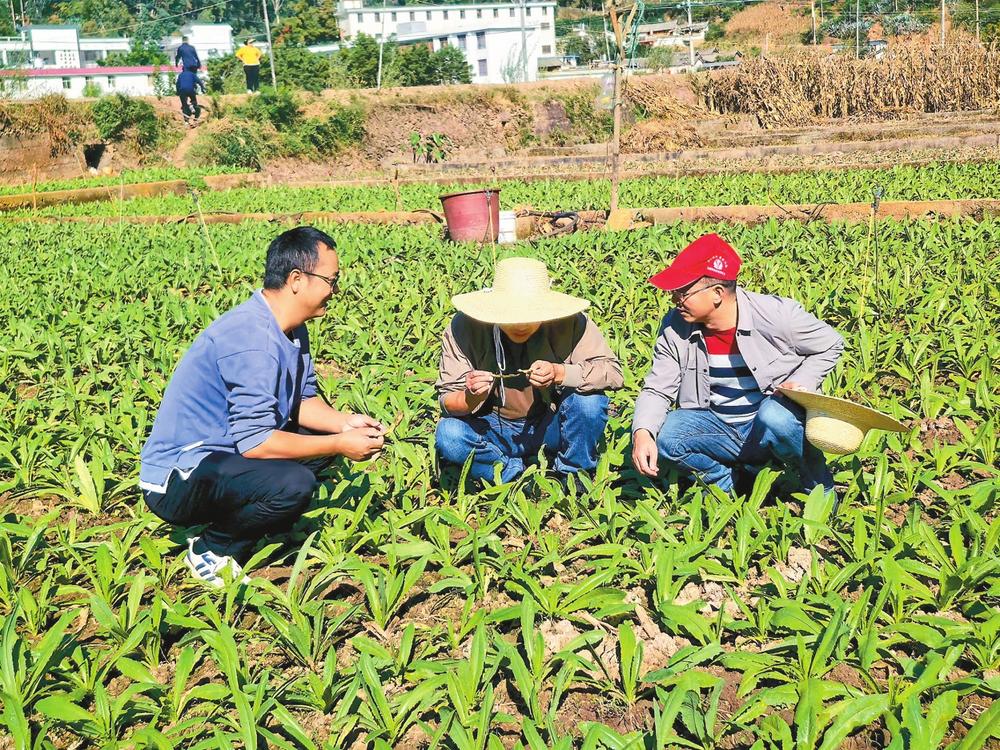 发展贡菜产业,不仅有项目带动、财政扶持,还有延伸至田间地头的科技服务。云南省祥云县蔬菜科技服务特派团把田间地头当成移动课堂,送科技进村入户,手把手将贡菜科学种植、管理知识传授给农户。“地里水分太重,叶子变黄是患了霜霉病,打药时要喷头朝上,从下往上打,因为病菌都躲在叶子背面。”科技特派员余伟才一边翻看有黄斑的贡菜叶子,一边叮嘱农户,贡菜地里最好用滴灌,不要用喷灌,否则叶子水分重,上下叶片触碰容易擦伤,加速霜霉病的发生和蔓延。种植户李松芳说:“从育苗移栽到中耕管理,什么时候施肥、什么时候打药,一直都有技术员到地里指导,给我们提供了很多帮助。”