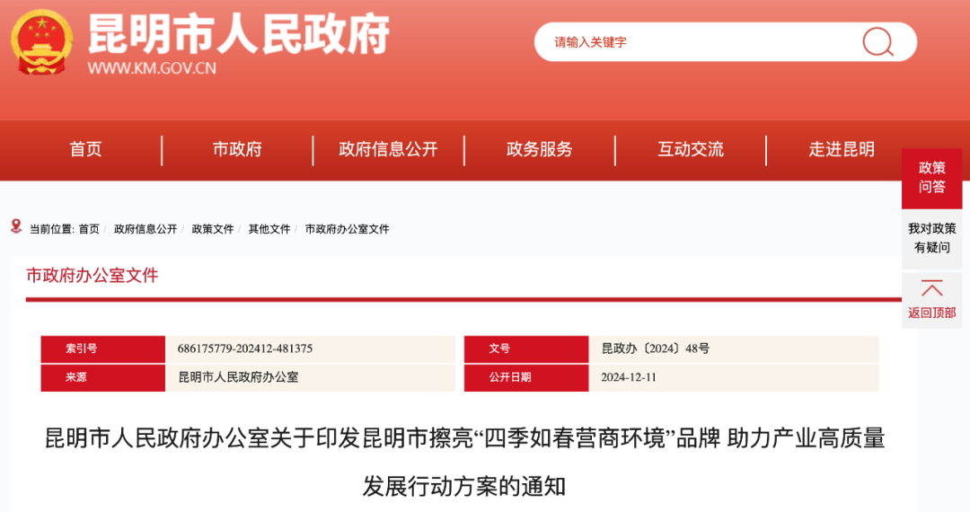 12月11日,市政府官网发布了《昆明市擦亮“四季如春营商环境”品牌助力产业高质量发展行动方案》,明确42项重点任务并分解细化为58条具体任务举措及工作目标,将优化营商环境融入抓项目、兴产业、促招商全过程,持续擦亮“四季如春营商环境”品牌,助力昆明产业高质量发展。