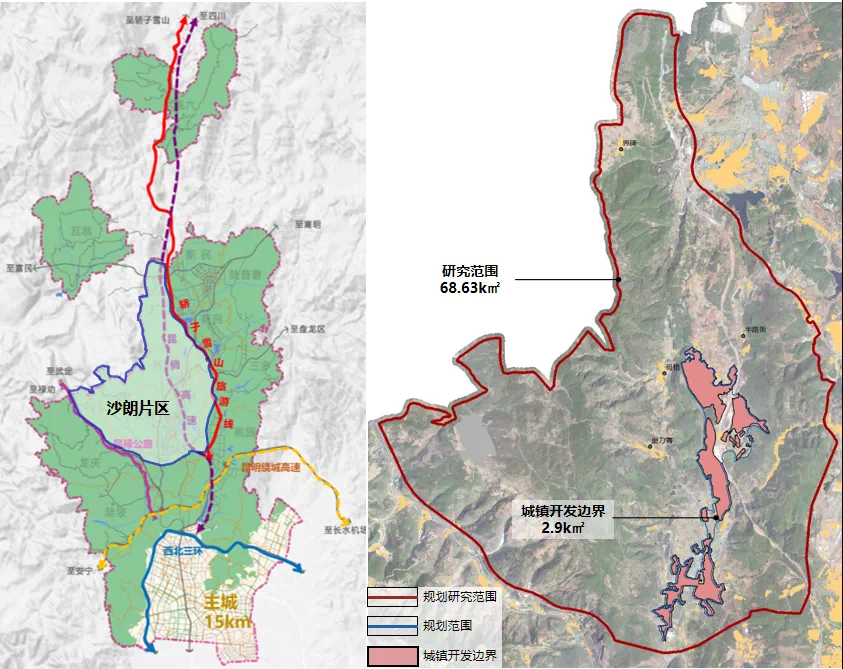 此次规划分为研究范围和规划范围两个层次。研究范围为五华区西翥街道沙朗片区全域,总面积68.63平方公里;规划范围国土空间规划划定的沙朗单元,总面积约380公顷,其中,城镇开发边界面积290.53公顷。