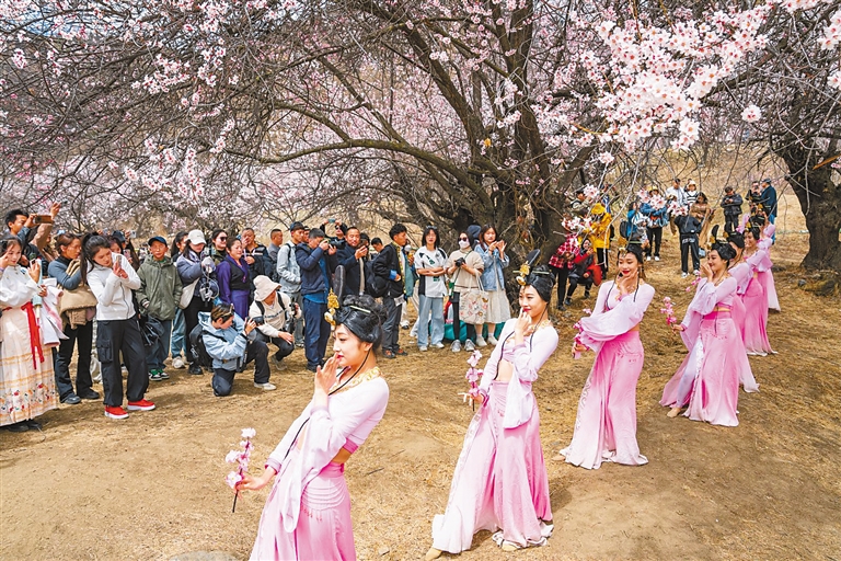 2024年3月31日,西藏林芝市第二十一届桃花旅游文化节在嘎拉村开幕,各类活动精彩纷呈,吸引众多游客。近年来,嘎拉村充分发挥自身优势,大力发展乡村旅游,让群众在家门口吃上“生态饭”“旅游饭”。 图为游客在林芝市巴宜区嘎拉村观看舞蹈表演(资料图片)。 新华社记者 丁增尼达 摄