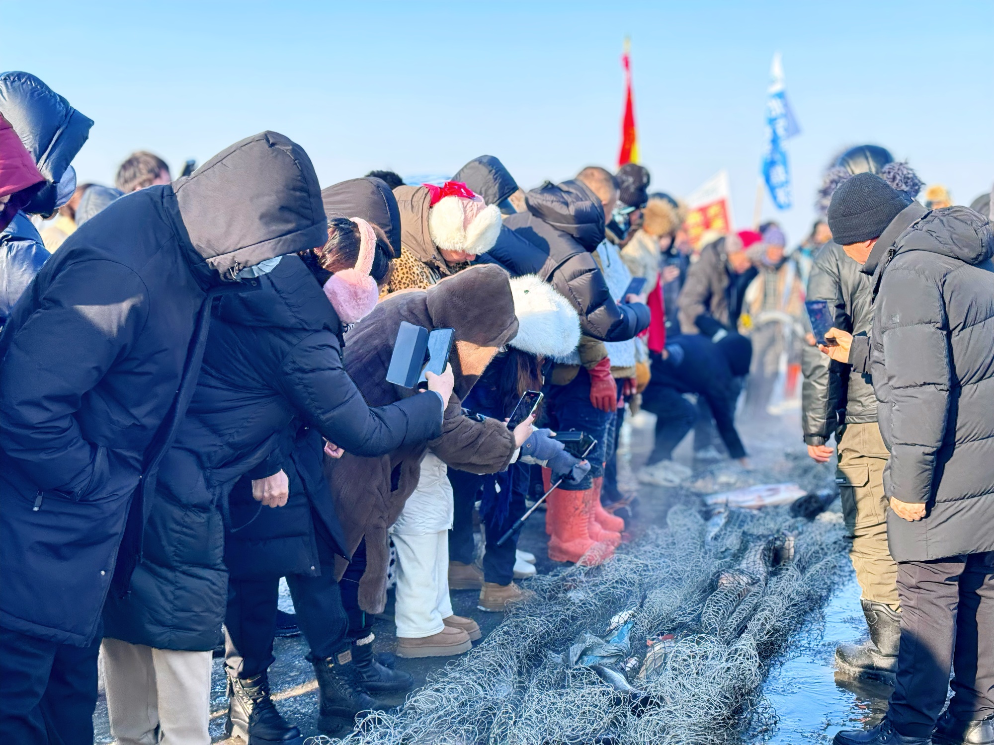 冬捕文化节中,最壮观当属起网时刻,在机器绞盘的作用下,渔网缓缓拉出冰面,网内各种大小鱼类热气腾腾、泛着鳞光,两侧游客纷纷拿出手机拍照,还有游客挑选心仪的鱼装袋购买。