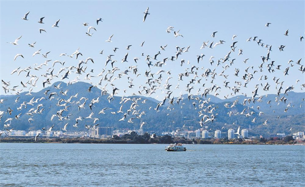 在昆明滇池草海,红嘴鸥漫天飞舞。 记者杨峥/摄