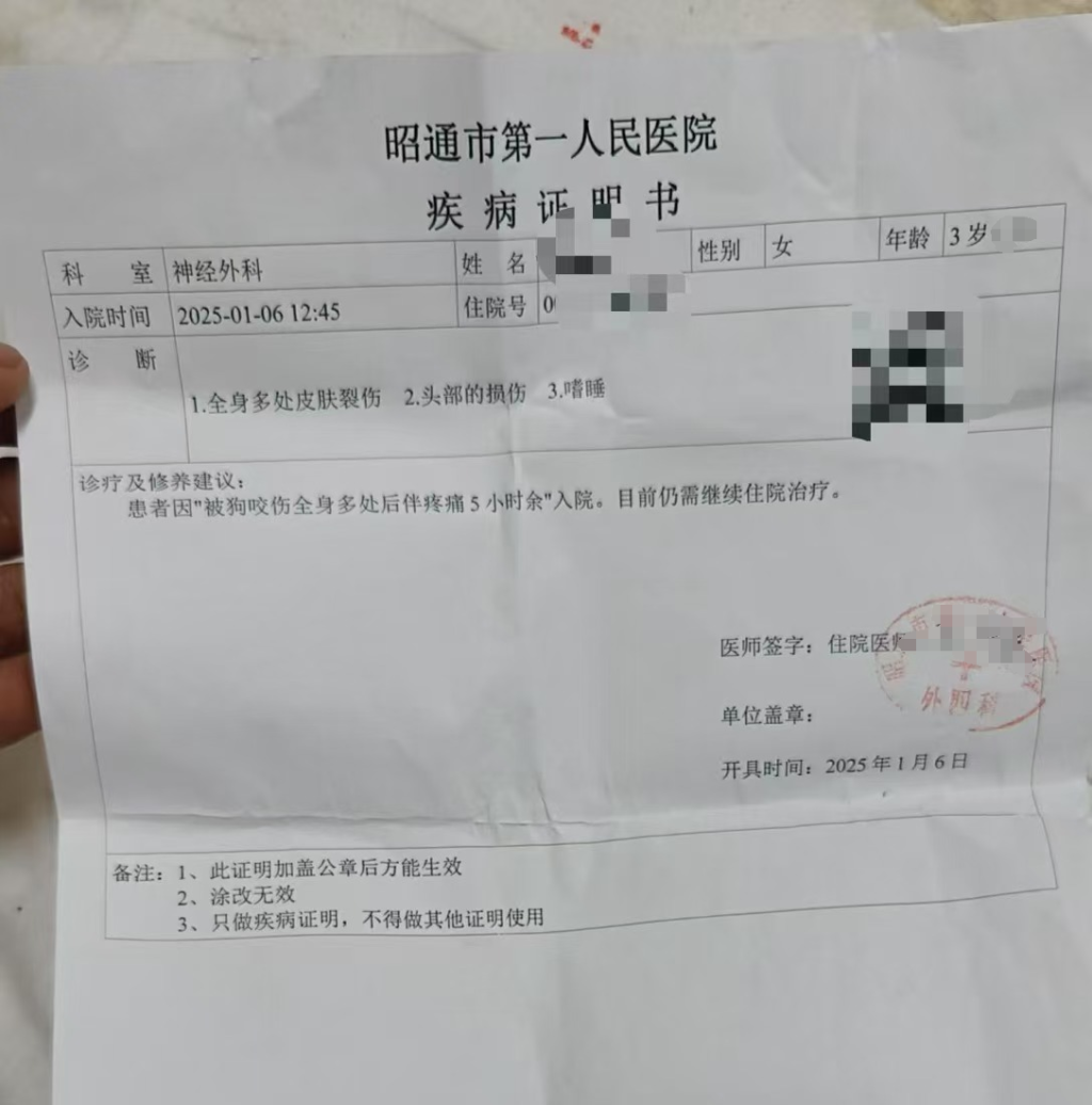 昭通市第一人民医院1月6日出具的疾病证明书显示:经诊断,患者全身多处皮肤裂伤、头部损伤、嗜睡。患者因“被狗咬伤全身多处后伴疼痛5小时余”入院,目前仍需继续住院治疗。
