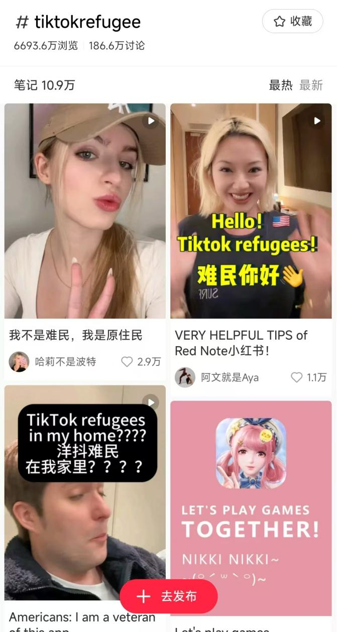 在短短几天内,海外博主在小红书上迅速开设账号,上传内容,并通过多语言互动吸引新观众。在“TikTok难民”(TikTok refugees)话题下,截至1月14日,总浏览量已高达6693.6万,讨论量突破186.6万。这些博主以短视频和图文形式,分享生活点滴、旅行攻略、美妆技巧等,迅速激发起中外用户间的高频互动。