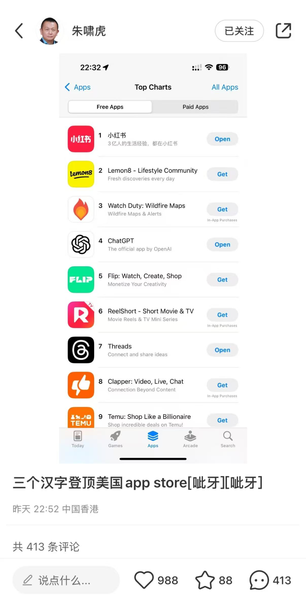 作为小红书的早期投资者之一,金沙江创投主管合伙人朱啸虎对这一波“TikTok难民潮”表现出极大的兴奋。他在1月13日晚间于小红书上发布动态:“三个汉字登顶美国。”这一简单的评论不仅表达了他对小红书迅速崛起的自豪,也体现出他对平台国际化战略成功的期待。