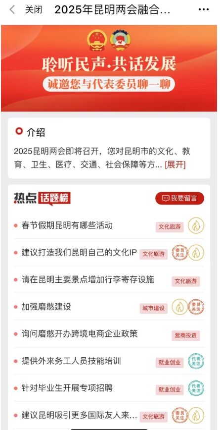 建议打造昆明自己的文化IP、昆明市区研学游项目能否增加、希望能针对毕业生开展专项招聘……2025年昆明市两会期间,不少网友通过“聆听民声共话发展 诚邀您与代表委员聊一聊”专题互动平台留言。围绕社会经济发展的方方面面,市民积极关注、踊跃建言,人大代表、政协委员回应关切、畅谈发展。