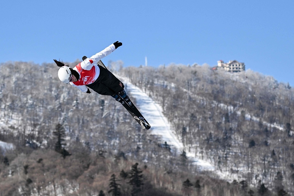 △2025年2月10日,中国队夺得哈尔滨亚冬会自由式滑雪空中技巧混合团体冠军。图为比赛中的齐广璞。