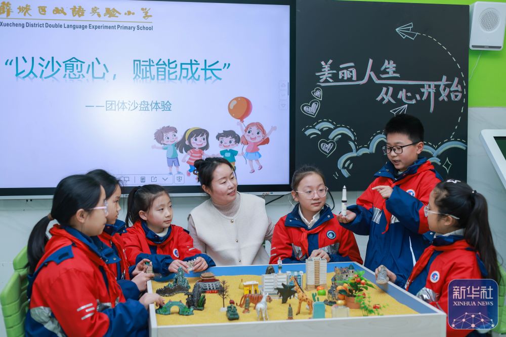2月14日,山东省枣庄市薛城区双语实验小学老师为学生进行心理健康教育。新华社发(王龙飞摄)