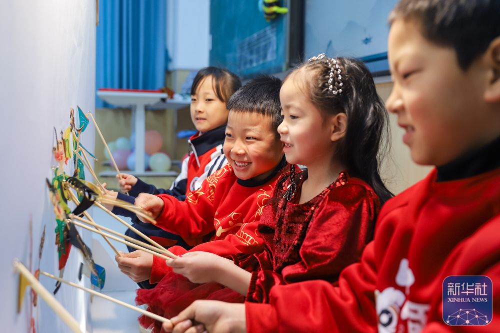 2月14日,学生在山东省青岛崇礼小学体验皮影戏表演。新华社发(张鹰摄)