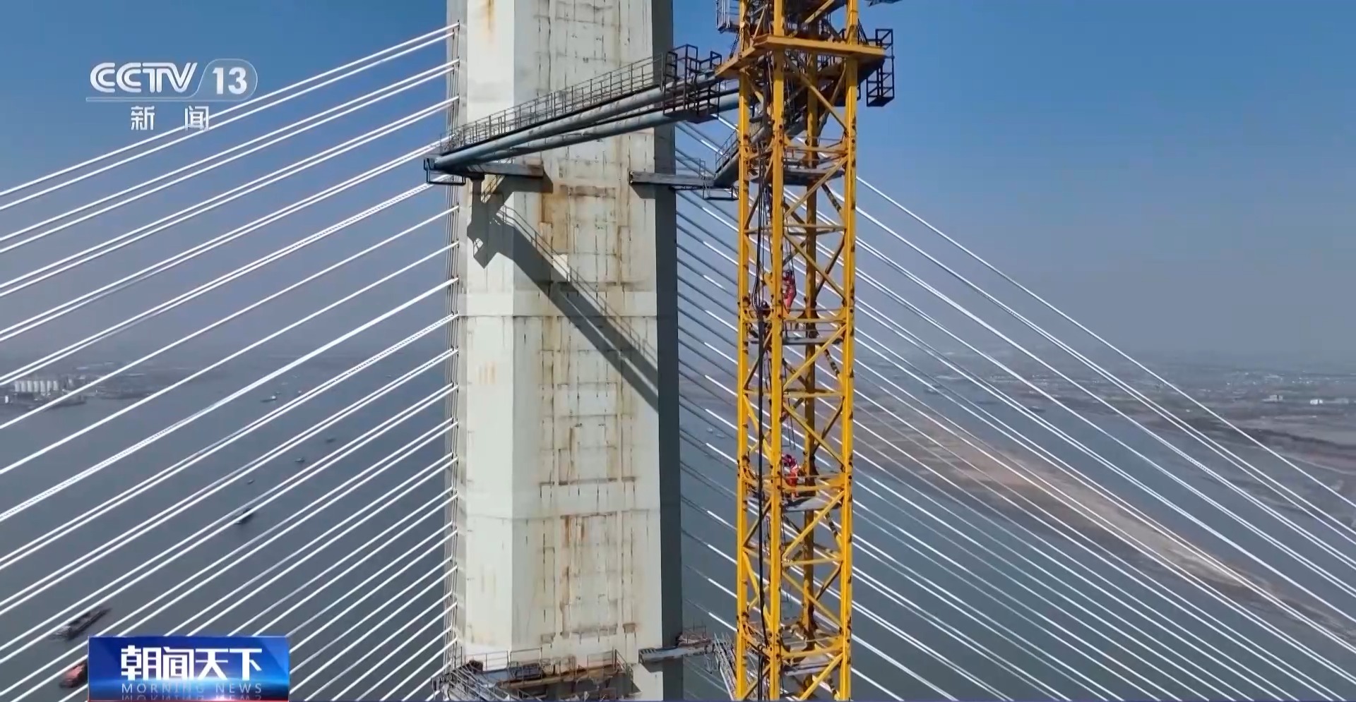 总台央视记者 李伟代:这就是用于世界最大跨度斜拉桥桥塔施工的超高塔吊,常泰长江大桥高达350米的主塔已经建成,师傅们徒手在塔吊上继续攀爬120米,到达离江面380米的塔吊顶端,对塔吊进行拆除前的全面检查。