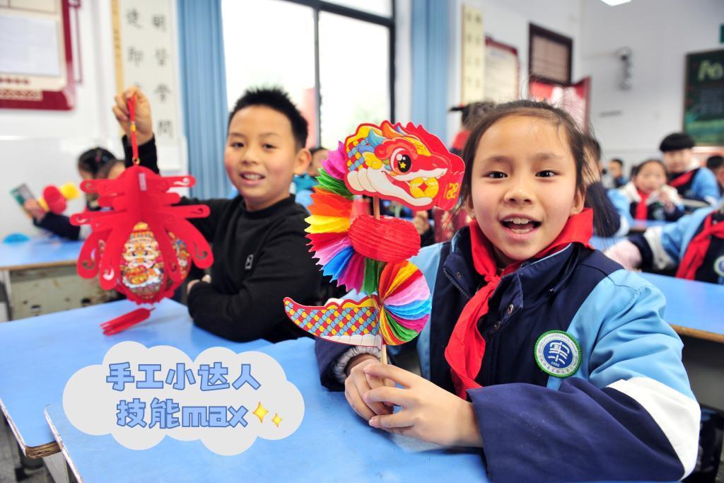 2月13日,湖北省宜昌市秭归县实验小学学生在“开学第一课”上展示自己寒假期间精心创作的手工作品。新华社发(王辉富 摄)