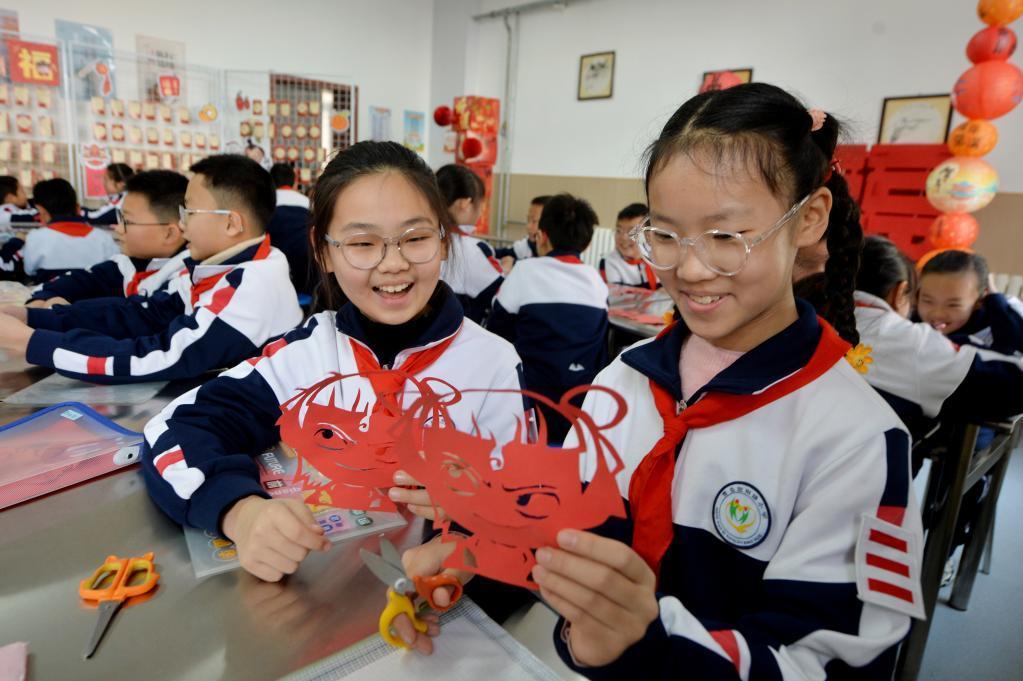 2月14日,两名学生在山东青岛宜阳路小学“传统文化润童心”主题活动中学习“哪吒”剪纸。当日,多地中小学开学,迎来春季新学期。新华社发(王海滨 摄)