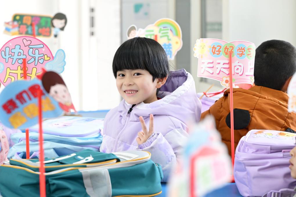 2月13日,河南省商丘市夏邑县育才学校学生参加“新学期新愿望”开学第一课主题教育活动。新华社发(苗育才 摄)